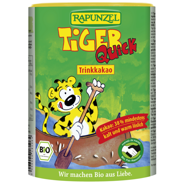 Tiger Quick cocoa drink powder - produced according to fair trade criteria by Rapunzel HAND IN HAND partners. Great chocolate taste thanks to 38% cocoa. The powder dissolves well in warm and cold milk.