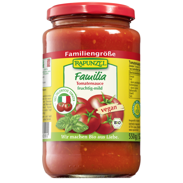 Fruity, mild basic sauce, subtly seasoned with fresh basil and sea salt. Family-friendly size. The tomatoes used for this tomato sauce are cultivated 100% in Italy. Rapunzel supports the breeding and preservation of seed-fast organic seeds, e.g. the tomato variety 'Mauro Rosso'.