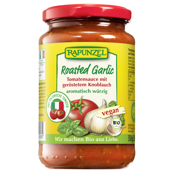 Aromatically roasted garlic combined with a pleasant hint of onion gives this tomato sauce its sweetish-savory flavor. Sun-ripened, harvest-fresh Italian tomatoes are carefully processed in the traditional way. Perfectly rounded off with the best olive oil and Italian herbs. Not only garlic lovers will savor this tomato sauce! The tomatoes used for this tomato sauce are cultivated 100% in Italy. Rapunzel supports the breeding and preservation of seed-fast organic seeds, e.g. the tomato variety 'Mauro Rosso'.