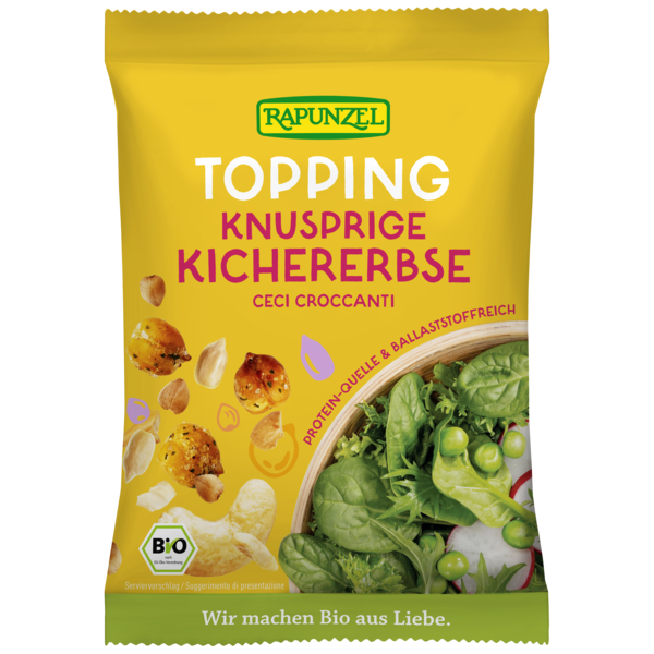 Tasty Topping - the crunchy extra! This delicious mix with roasted and seasoned crispy chickpeas from Italy and roasted cashew nuts conjures up a wonderfully aromatic taste and a great crunch in the dish. It also provides plenty of fibre and is a valuable source of plant-based protein. Just get topping & enjoy!