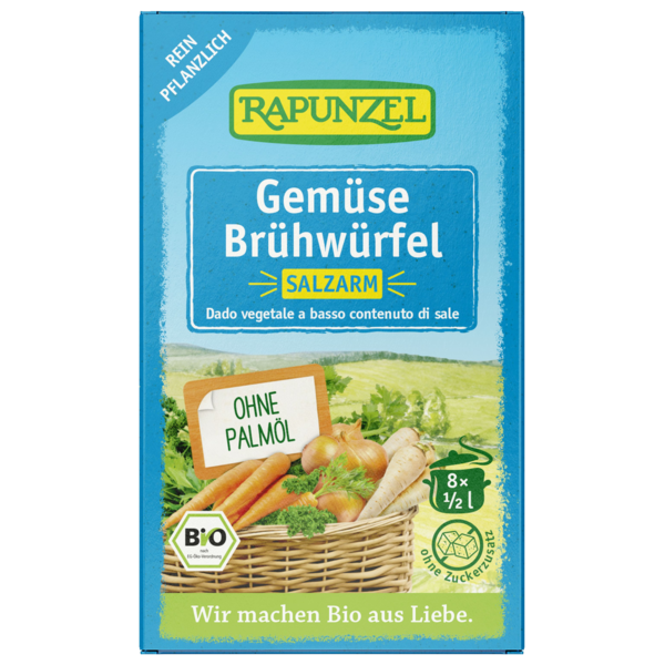 The low salt vegetable stock cubes are ideal for all those who want to reduce salt in their diet. The broth has a balanced flavour due to a lot of vegetables and various herbs. With no added sugar.