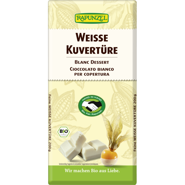 Soft pralines, sweet fruit or delicate pastry would taste only half as good without a cover of soft melting, velvety chocolate glaze. Wonderfully aromatic cocoa butter and whole milk with a touch of Bourbon vanilla refine your cakes, pastries or pralines. The chocolate couverture is made with fair trade cocoa and sugar and belongs to the Rapunzel HAND IN HAND product range.