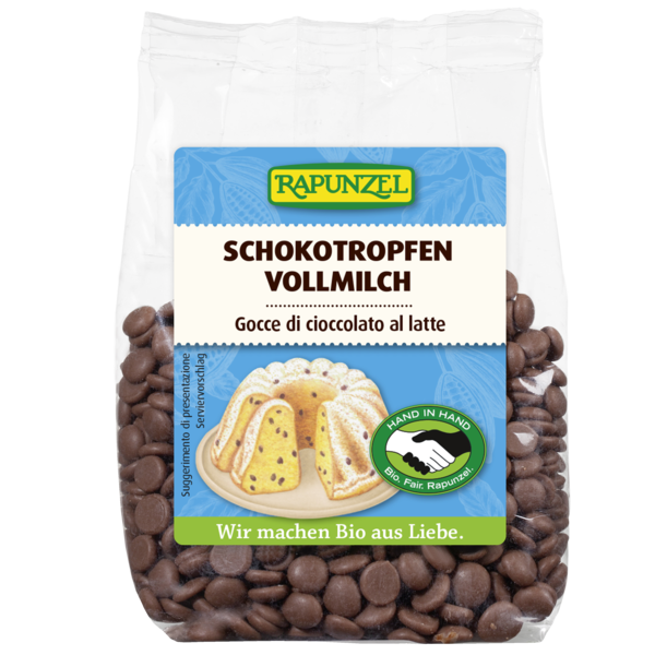 Popular whole milk chocolate as drops - produced according to fair trade criteria by Rapunzel HAND IN HAND partners. The chocolate drops maintain their shape during baking.