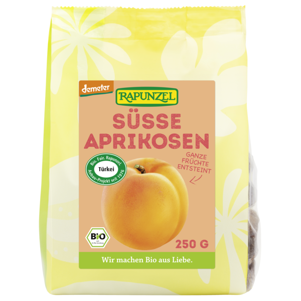 Sun-ripened, sweet demeter apricots from the Rapunzel Turkey project. The fruits are cultivated, harvested and sun-dried in the Malatya region in East Anatolia. Their natural orange-brown color is a quality feature for non-sulphurized apricots.