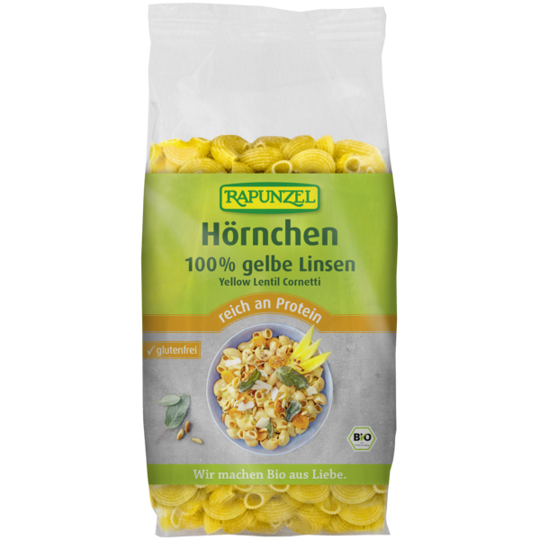 The cornetti are made from 100% ground yellow lentils. Water is added to the ground legumes. The resulting dough is pressed into the respective pasta shape and subsequently dried.