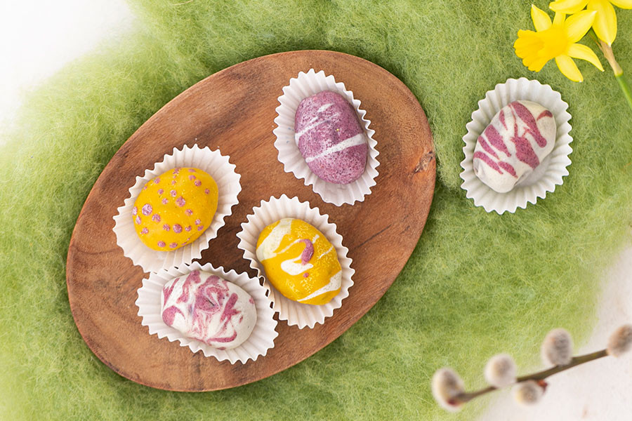 Flatten the apricot balls, fill them with marzipan balls and shape them into an Easter egg. Heat the white couverture in a water bath and then coat the Easter eggs with the liquid couverture or dip in the couverture. Drain and place on baking paper until the chocolate coating has set. If you like it colorful, stir the desired food color into the melted cocoa butter. Let stand for a few minutes, then stir in the chocolate coating. Cover the Easter eggs with colored chocolate coating.