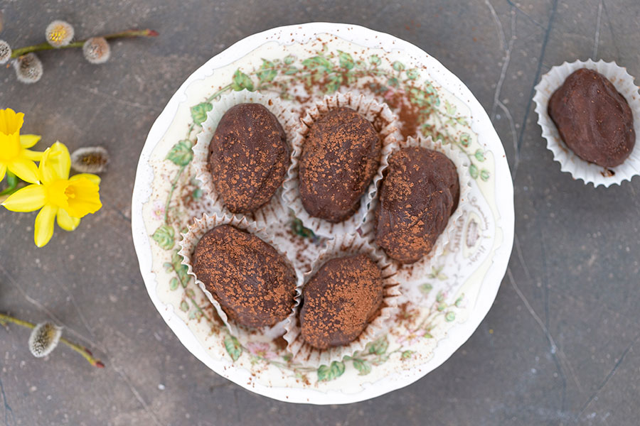 Cut off pieces with a spoon and shape the dough into balls, then Easter eggs. Cover with the melted chocolate coating and place on baking paper until the chocolate coating has set.
