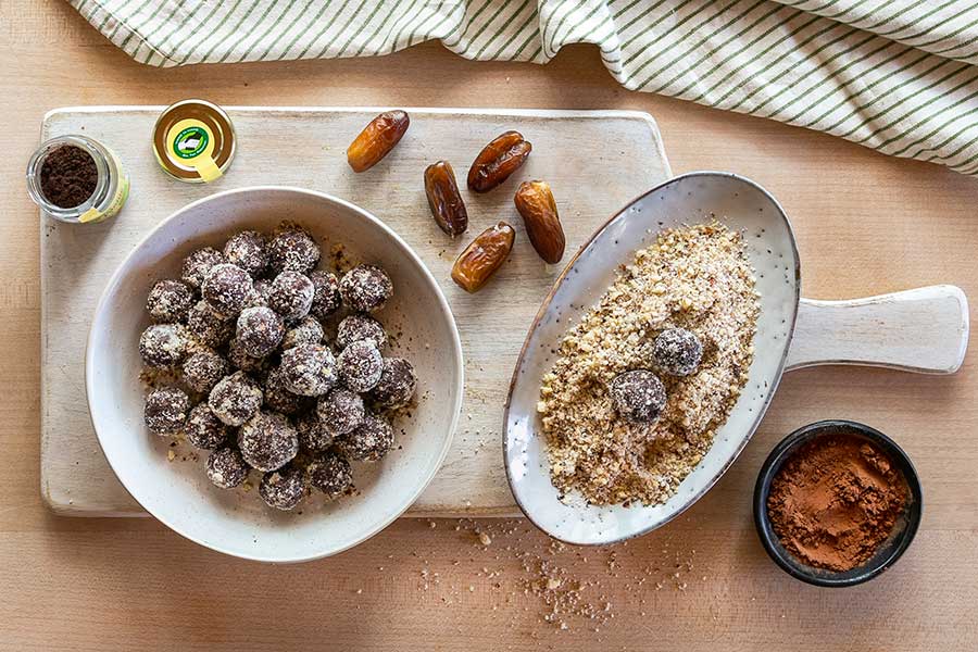 Chop the dates in the food processor or blender until they form a ball. Roast the hazelnuts in a pan and remove the peels after roasting by rubbing the hazelnuts with a kitchen towel.