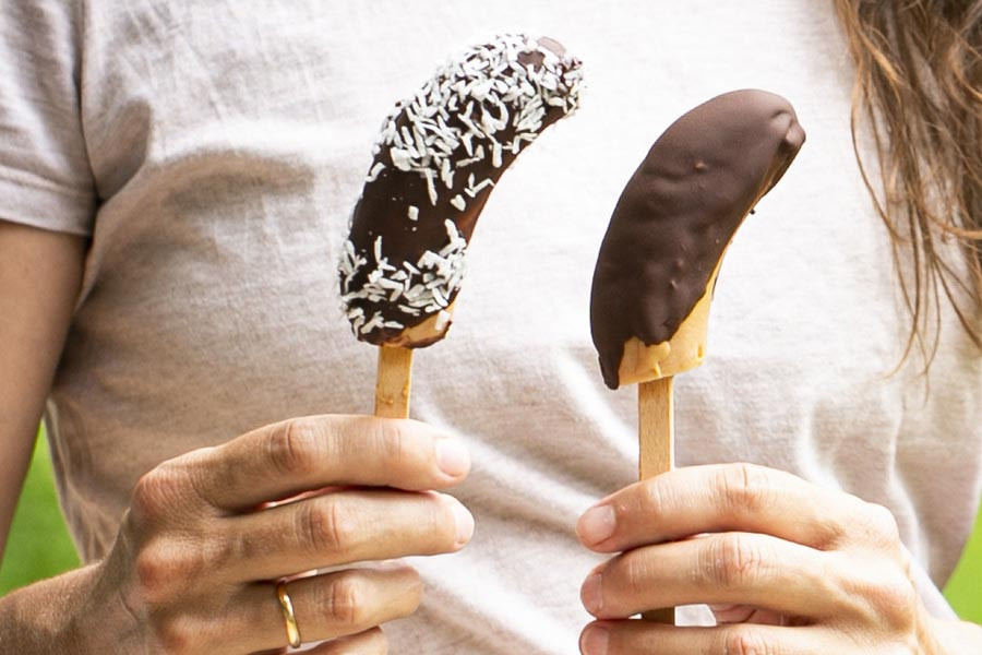 Then dip the bananas in the liquid peanut butter and place in the freezer for about 20 minutes. Now warm the bittersweet chocolate in a water bath and dip or coat the banana with the peanut layer in the chocolate coating. Finally, in the freezer until everything is fixed.