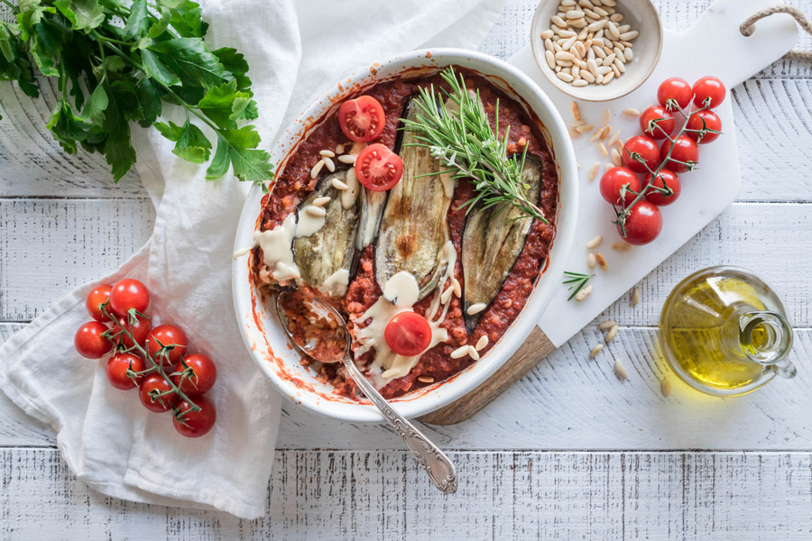 Cut the aubergine into thin slices lengthwise and sprinkle with salt. Then fry in olive oil from both sides. Peel and slice the potatoes. Make a casserole dish with some tomato sauce and place a few eggplant then potato slices on top. Cover again with tomato sauce and layer aubergines and potatoes on top. Finish with eggplant slices and the remaining tomato sauce.