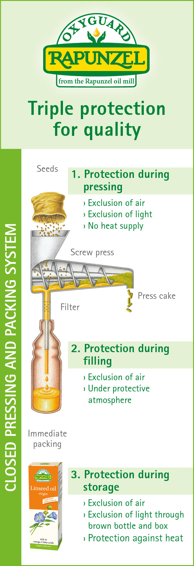 In comparison with the isolated administration of concentrated, long-chain Omega-3 fatty acids as e.g. in fish oil capsules, we do not use any isolated substances for our oils but only carefully processed, natural substances. Fatty acids are therefore supplied within the original food matrix that contains many additional, health-promoting substances such as phytosterols, tocopherols, carotenes, polyphenols and many more. Exterior influences such as light, oxygen and heat accelerate the deterioration of the extremely sensitive ingredients. The OXYGUARD® process is performed under exclusion of light and air. High temperatures and high pressure are also avoided. Thus, the oil seed ingredients are preserved as far as possible, from the opening of the seed pods, through the pressing process all the way to the filling and packaging processes. An opaque cardboard box protects the oil until opening.