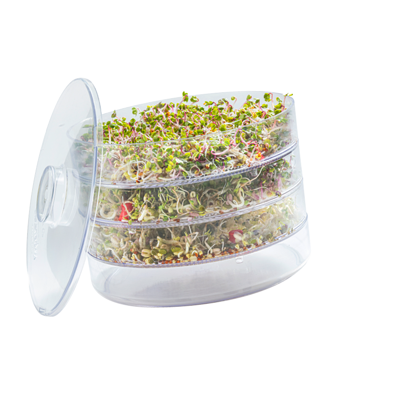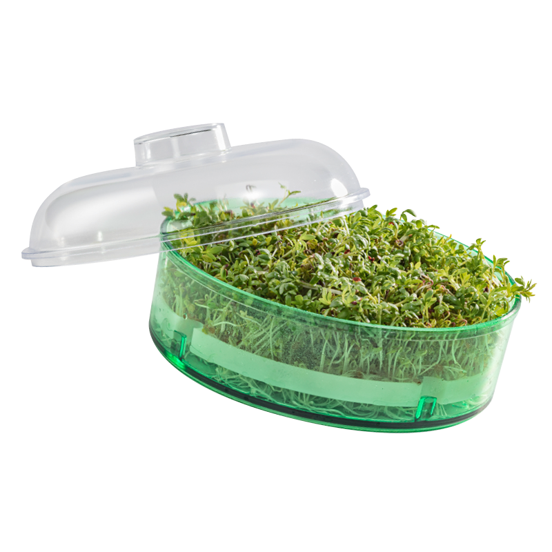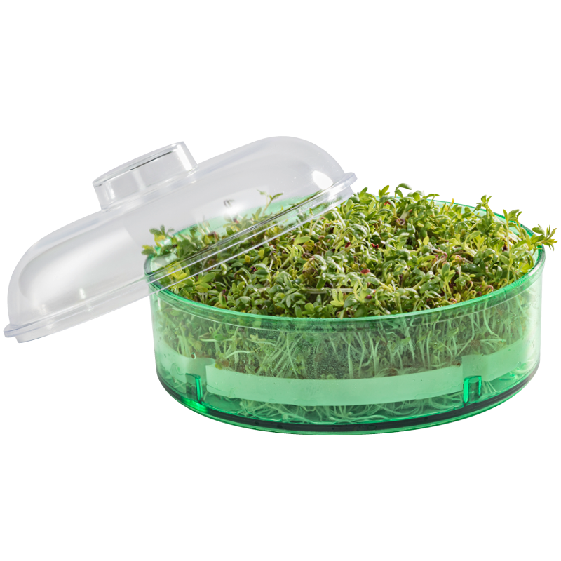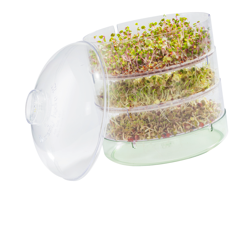 The Mini Greenhouse enables several types of sprout to be grown together on several levels. Any seed type can be used. The germinator functions according to the greenhouse principle, and therefore includes a lid.