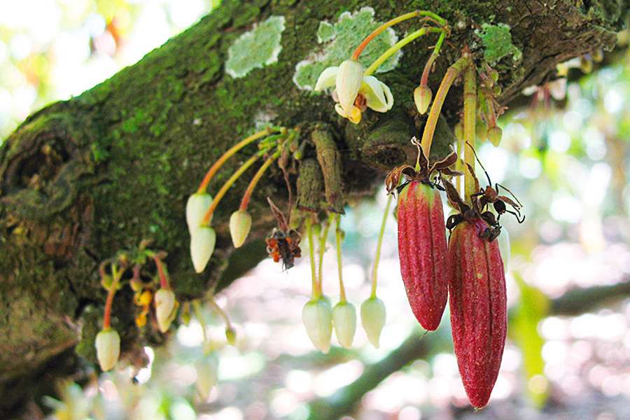 Kakaofrüchte und Blüten wachsen gleichzeitig am Kakaobaum