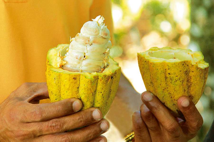 Frisch aufgeschlagene Kakaofrucht mit Kakaobohnen in der Pulpa