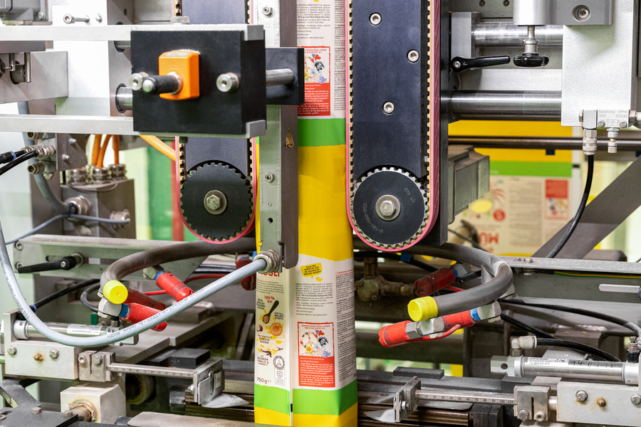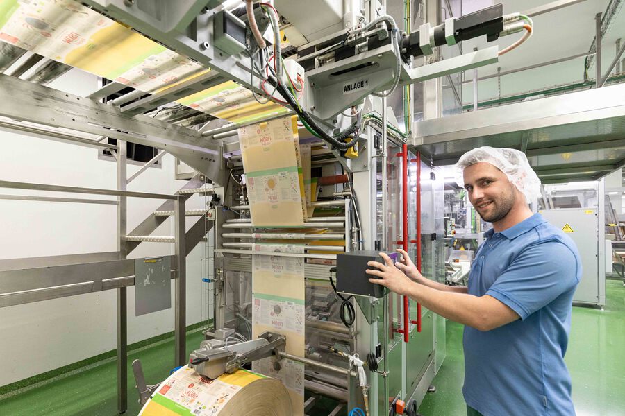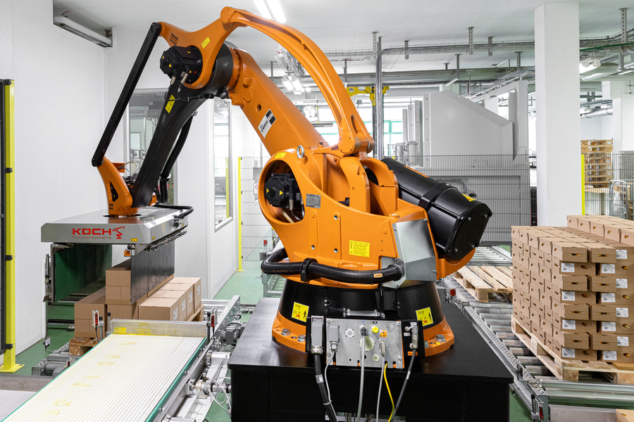 A robot neatly stacks the finished boxes of muesli on pallets. Thereafter, they are stored in our logistics centre and shipped all over the world.