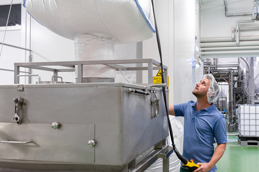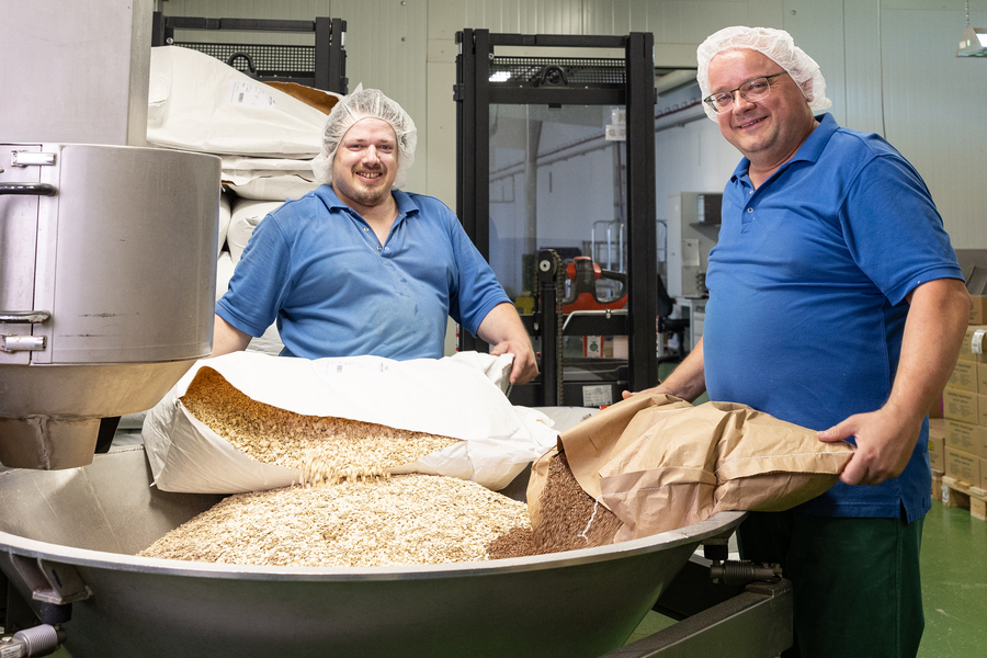 Rapunzel employees fill the local flakes into the mixer together with the other valuable ingredients – finely weighed, and always depending on the recipe. Nuts and selected seeds are gently roasted in advance, in our own nut roasting plant. The mixer ensures the creation of a uniform mixture. This ensures that each bag of muesli contains as many nuts or berries as possible.