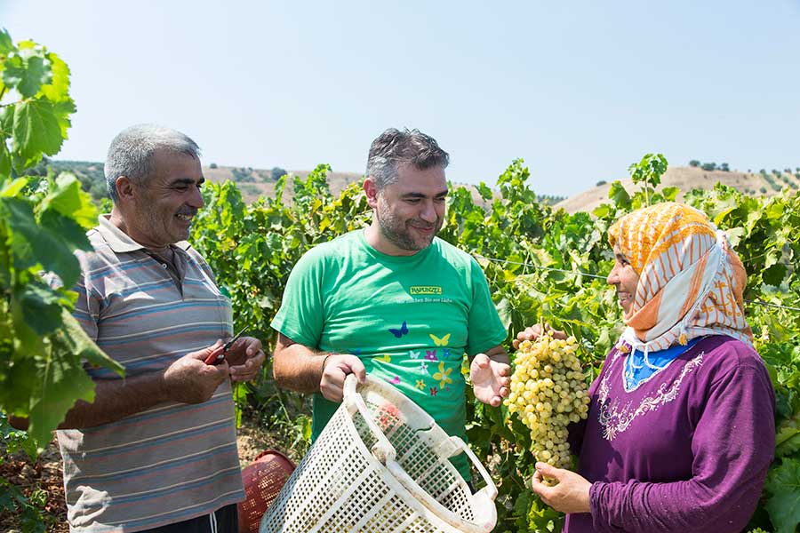 Emrah Dağdeviren (center), agricultural project director at Rapunzel Turkey, talks with Nuri Sezen and his helper, Senay Pekkara, about this year's developments
