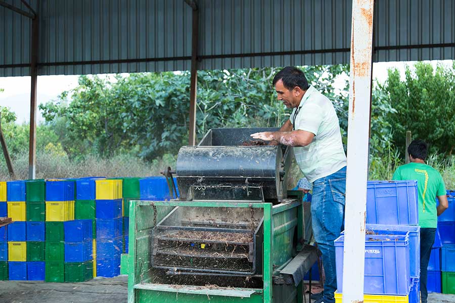 The dried sultanas are already roughly cleaned on site in a vibrator in order to separate the stems from the fruit.