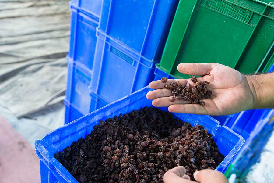 The dipping: a natural mixture of water and Kali is sprayed onto the freshly harvested fruits. The mixture speeds up the drying process and gives the sultanas their brighter color