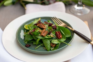 Candied pecan nuts with cranberries on a bed of spinach leaves with a toasted sesame dressing