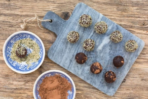 Rainbow chocolate bars of puffed rice, topped with hemp, chia and buckwheat