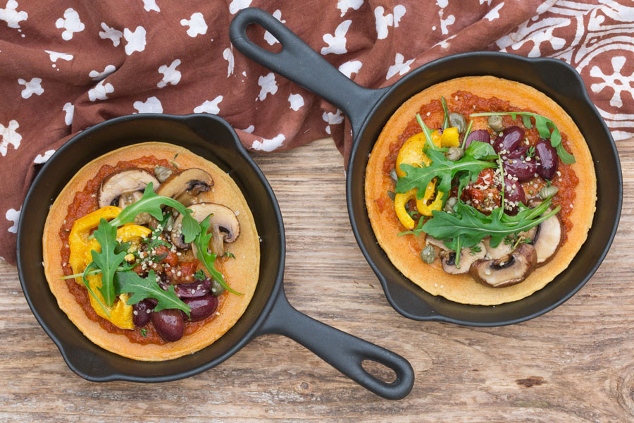 Socca Pizza (chickpeas patties) with Pesto, Olives and arugula