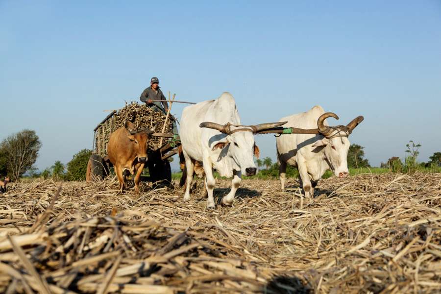 Das Zuckerrohr wird mit der Unterstützung von Tieren zum Feldrand gebracht