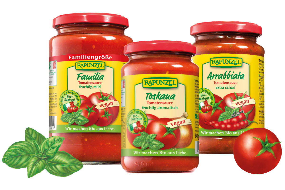 Depending on the kind of tomato sauce, other fresh ingredients are added. The Rapunzel Familia tomato sauce is only refined with a dash of sea salt and some basil. Other tomato sauces such as Tuscany or Traditionale are made with fresh vegetables and other spices. The finished tomato sauces are directly filled into jars. In the end, the jars are gently pasteurized.