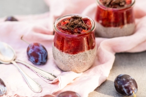 Coconut chia pudding with homemade cinnamon plum sauce